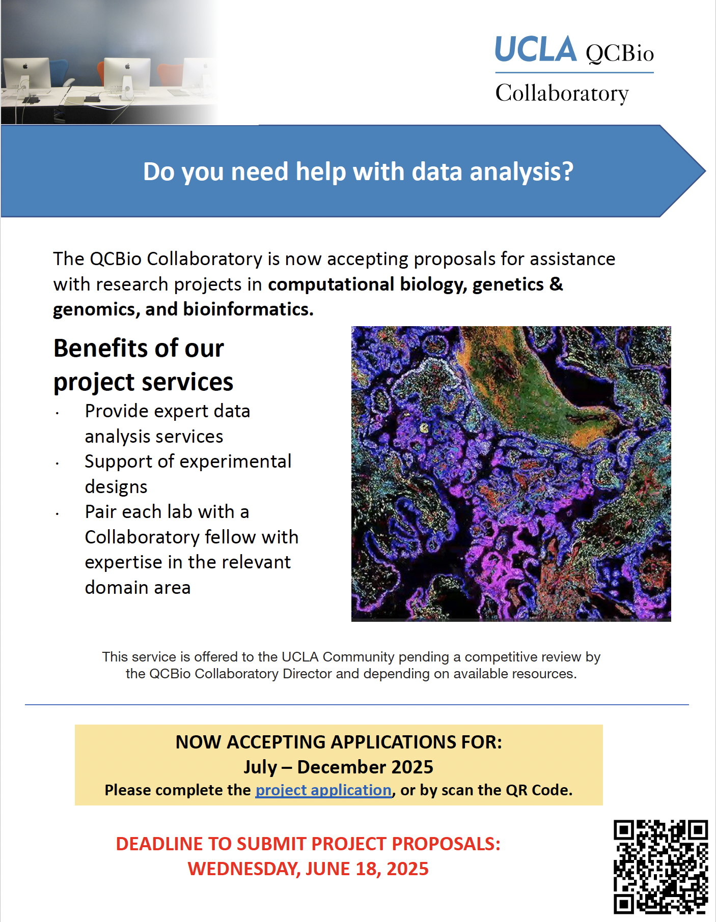 Twice a year, (June and December) the QCBio Collaboratory accept proposals for assistance with research projects in computational biology, genetics & genomics, and bioinformatics. This service is for the UCLA Community, and all projects are selected on a competitive basis by the director depending on available resources. In return for their services we ask collaborating fellows to be acknowledged as an author on any eventual publications.