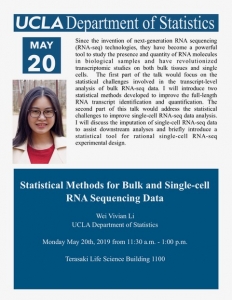Wei Vivian Li from the Department of Statistics will be presenting for her dissertation defense on Monday, May 20, 2019, from 11:30am-1:00pm in the Terasaki Life Science Building, Room 1100 …